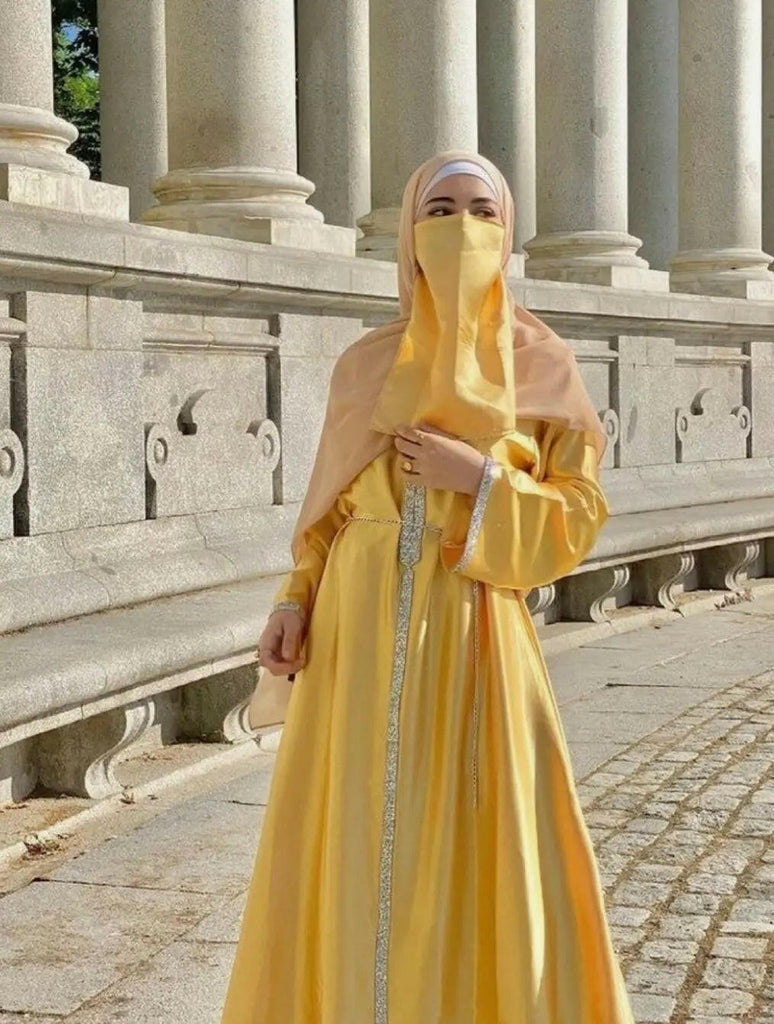 3 pc modest yellow abaya dress for everyday wear abaya with belt and veil