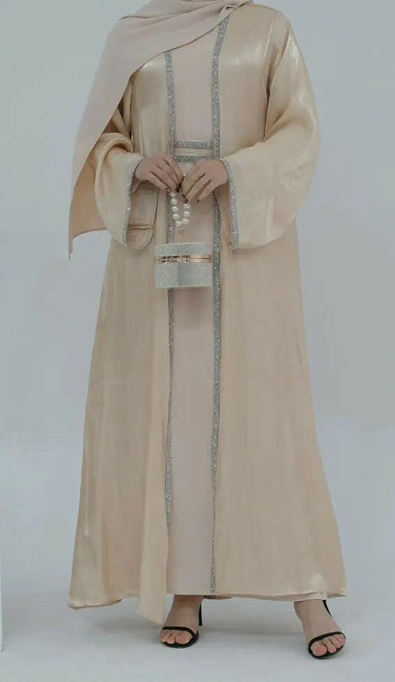4pc open front beige abaya + dress Dubai kimono + belt and veil for everyday wear | abaya-online.com