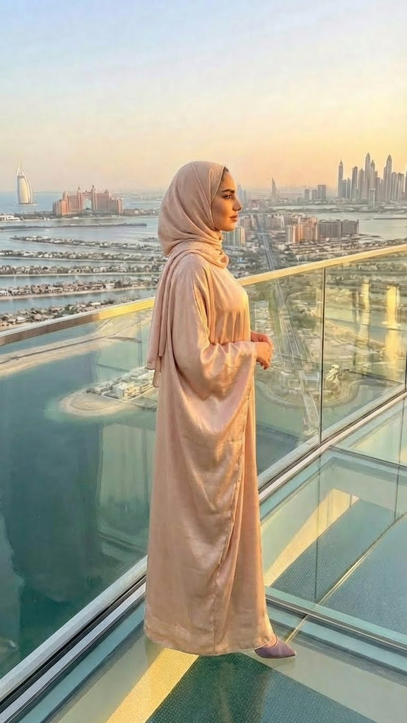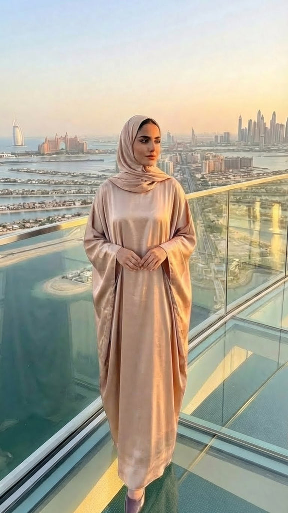 BEIGE SILK ABAYA & HIJAB SET DUBAIBEIGE SILK ABAYA & HIJAB SET DUBAI