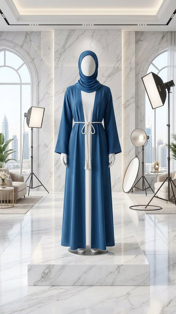 Embrace elegance and tradition with the Blue & White Abaya & Hijab Set, a luxurious 4-piece outfit handcrafted in Dubai for the modern modest woman. Thoughtfully designed for comfort and sophistication, this set includes: