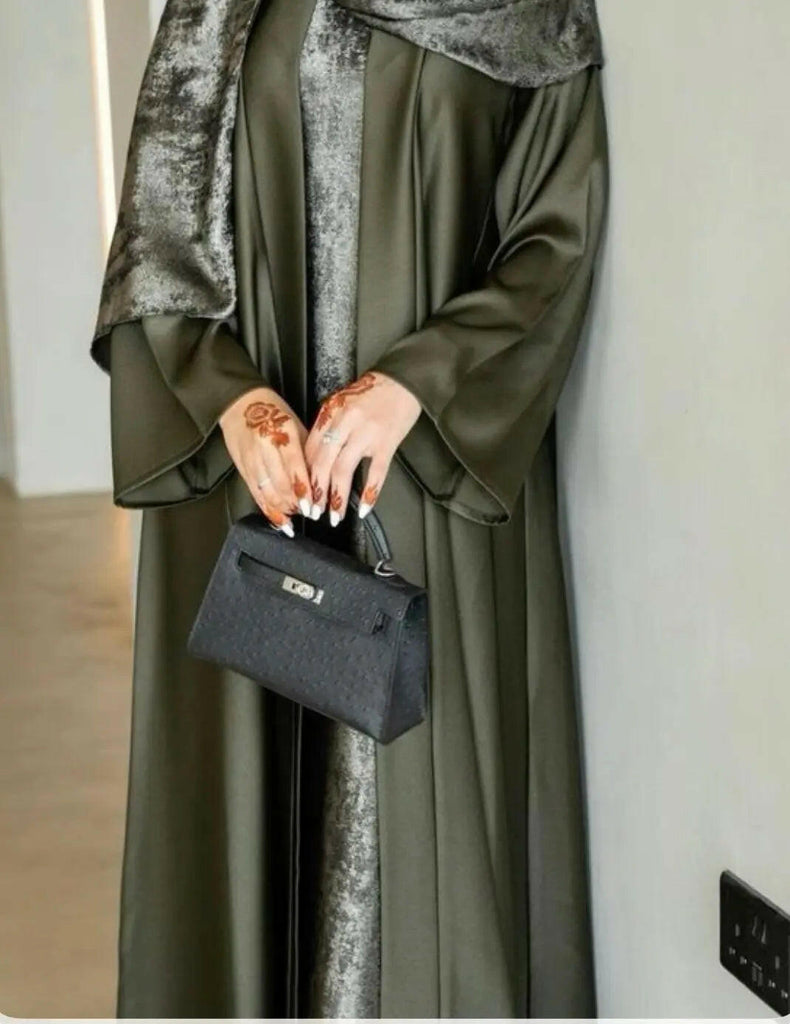 The overall effect of this  green olive abaya is one of serene elegance and purity. The luxurious fabric, delicate embroidery, and sleek design all combine to create a truly stunning garment that's perfect for special occasions or everyday wear.