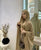 Luxurious brown fabric,Rich, earthy brown hue with a smooth, matte texture, modern design with intricate embroidery , Elegant, flowing silhouette with a relaxed fit, Long, flowing sleeves with a slight flare at the wrist