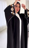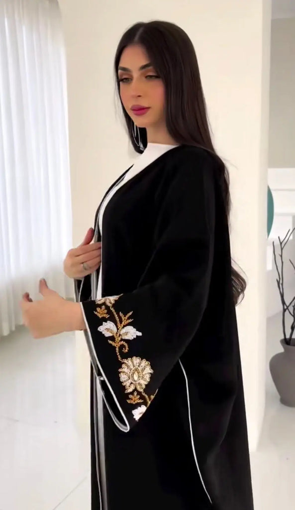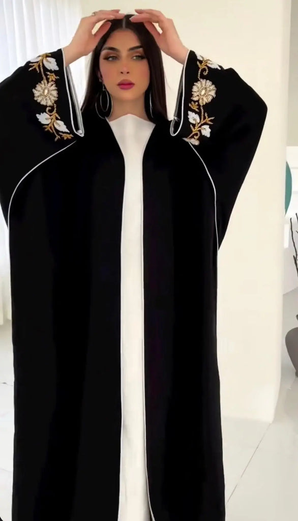 Open Black Abaya with White Dress is an elegant 2-piece abaya set handmade in Dubai, designed for the modern modest woman. Featuring a flowy black open abaya, this piece is beautifully enhanced with delicate floral embroidery around the sleeves and fine white stitching along the edges. The contrasting white inner dress adds softness and sophistication, making it ideal for both everyday wear and special occasions.