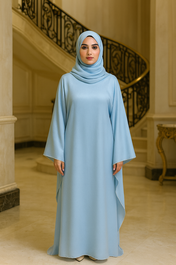 Embrace elegance and tradition with the  Pastel Silk Blue Abaya & Hijab Set, a luxurious 2-piece outfit handcrafted in Dubai for the modern modest woman. Thoughtfully designed for comfort and sophistication,
