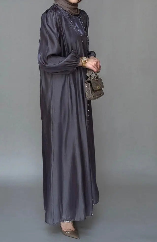 Shiny pearly grey outer abaya with pearl embellishments