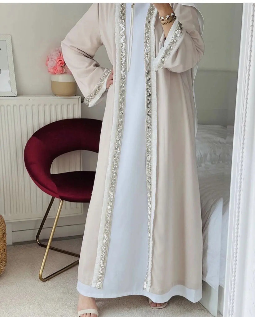 Light pink-peach open front abaya – flowy, elegant, and easy to layer