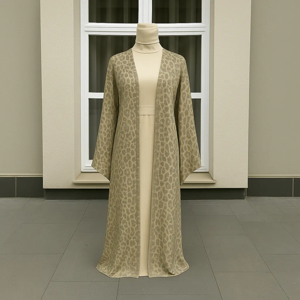 A beige leopard open abaya for coverage and ease,