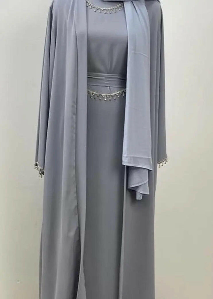 Discover timeless elegance with our Gray Open Front Dubai Ladies Abaya Arab Dress and Hijab Veil! Made of high-quality fabric, this 4 piece set is perfect for daily wear, providing style and comfort. With its open front design, it offers versatile styling options while the hijab veil adds a touch of modesty. Elevate your wardrobe with this sophisticated design