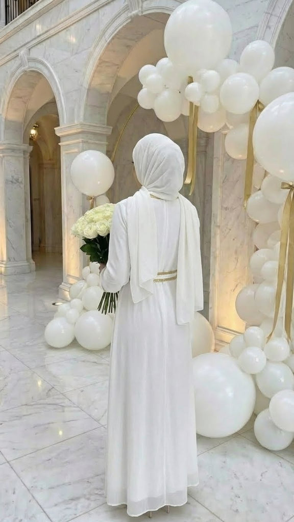 This elegant white 3 Piece Abaya Dress Made in Dubai, UAE. Perfect for Ramadan and Eid. Express Postage Shipping World Wide from Dubai to anywhere in the world. Authenticity A+