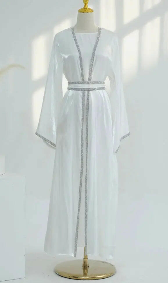 4pc open front white abaya + dress Dubai kimono + belt and veil for everyday wear | abaya-online.com