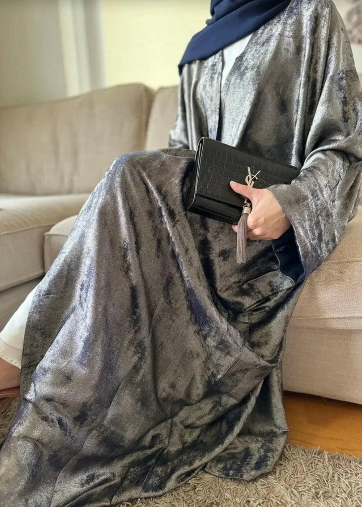 This 3-piece silver abaya  dress with hijab . made with high-quality fabrics from Dubai. Enjoy the finest materials and craftsmanship from this prestigious fashion hub. Elevate your style with confidence.