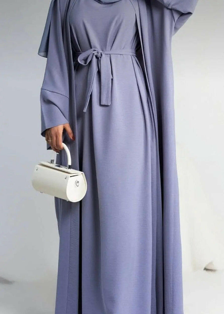 4-teiliges himmelblaues Abaya-Kleiderset mit offener Vorderseite, Gürtel und Schleier für den täglichen Gebrauch, lässig für den Alltagslook4-teiliges himmelblaues Abaya-Kleiderset mit offener Vorderseite, Gürtel und Schleier für den täglichen Gebrauch, lässig für den Alltagslook